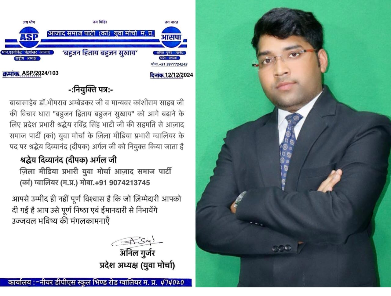 ग्वालियर : दिव्यानंद अर्गल( दीपक ) ग्वालियर आज़ाद समाज पार्टी (कां) बने ग्वालियर जिला मीडिया प्रभारी